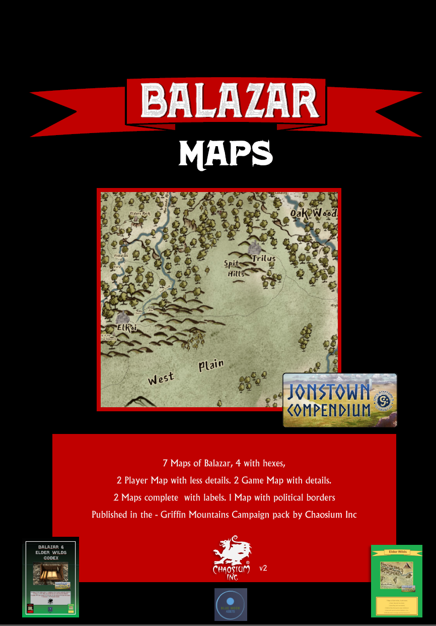 Sept cartes picturales de Balazar en haute résolution (4266 x 2400 pixels : 14,22 pouces x 8,00 pouces, à peu près le format de papier US Legal à 300 DPI), dessinées sur Wonderdraft sur la base de la carte officielle de "Griffin Mountain". Il y a quatre cartes de base (celle des joueurs, celle du maître de jeu, la carte détaillée et la carte politique), chacune présentée dans un format sans hexagone et dans un format de 5 miles d'hexagone, la carte politique n'étant présentée qu'avec des hexagones. La carte des joueurs est d'un style différent de celui des cartes du maître de jeu et des cartes détaillées ; la carte détaillée donne le nom de chaque foyer Balazaring ainsi que des principales régions, rivières, gués et citadelles.